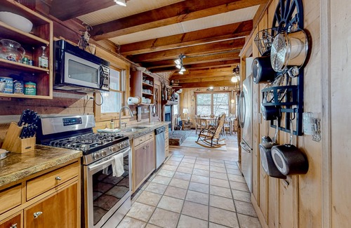 Inside, discover rustic touches and numerous modern amenities to ensure the utmost comfort for you and your guests. Whip up your favorite recipes in the well-equipped, full kitchen with stainless steel appliances and then dine indoors or out. After meals, settle into the main living area and stream your favorite channels, or borrow a book and make your way into the upstairs reading nook located across the suspended walkway. The front porch provides you with a wonderful spot to unwind and listen to the wildlife in a comfortable rocking chair.