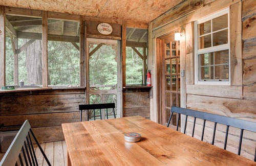 Wake up to the sounds of birds singing and step out into nature for a morning stroll in the meadow. Doggett Cabin enjoys the privacy of a 50-acre property, including a fire pit, a mountain stream with waterfalls, two fishing ponds, and a hiking trail. While the cabin does provide limited internet service, this is the perfect opportunity to put away your devices and reconnect with loved ones.