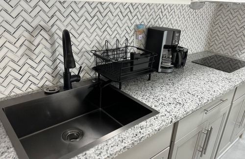 The “Solaris” guest house is a high-tech geodesic dome, part of a two-dome structure. The hosts/owners live in the main dome and offer a private front dome for vacation rental with private entry and parking for up to three vehicles. The downstairs includes a modern living room with a 65-inch TV, Bluetooth stereo, and an electric fireplace. A dining room with seating for up to six and a fully equipped kitchenette with a microwave, 2-burner electric induction stove, large sink, coffee maker, toaster, and a full-size refrigerator.