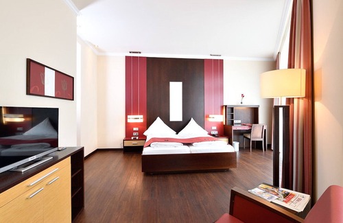 The hotel room has a double bed with two single duvets. The spacious room is equipped with all conveniences, including a minibar, desk, television and armchair. There is also a safe that you can use free of charge and coffee and tea making facilities are available. The bathroom has a shower, washbasin, hairdryer and toilet.