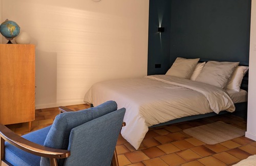 Offering a double bed nestled in its alcove, it provides a soft and intimate atmosphere. It opens to the east onto a shaded terrace under its arbor, which interacts with the olive trees in the garden and the village in the background. The open bathroom is directly adjacent to the bedroom, from which one can access its separate toilet.