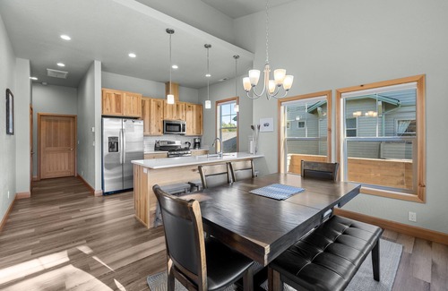 Inside, you'll find a stylish and thoughtfully designed space featuring high-end finishes, vaulted ceilings, and plenty of room for families or groups to relax and unwind. Kick back in the cozy living area with a plush leather sofa, gas fireplace, and a large smart TV ready for movie nights (just log in with your streaming accounts).