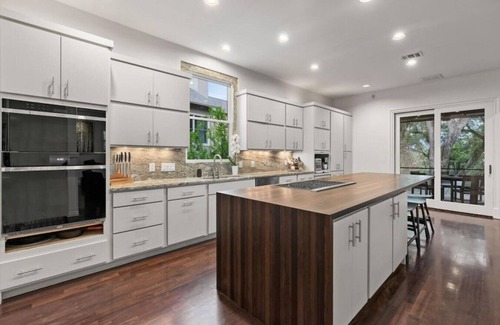 This modern home with a heated pool is your private downtown Austin oasis. Located in the city's most desirable area, it's walkable to iconic bars, restaurants, shopping, swimming holes, and festivals. The 4-bedroom, 3-bath home features a heated pool with a cascading waterfall from the spa, and indoor and outdoor living, dining, and kitchen areas shaded by beautiful Heritage Oak trees with stunning downtown skyline views. Enjoy the perfect blend of luxury, comfort, and convenience!