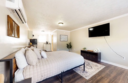 This property is made up of four separate studios that can be rented separately or together and are ideal for couples, families, and groups of friends! Each studio is conveniently equipped with a full kitchen (full-size fridge, stove, oven, and coffee maker), partial AC units to keep you nice and comfortable during your stay, an en suite bathroom for added privacy, a smart TV with streaming services, and free WiFi. You will also have access to on-site shared amenities, including a BBQ area with a firepit.