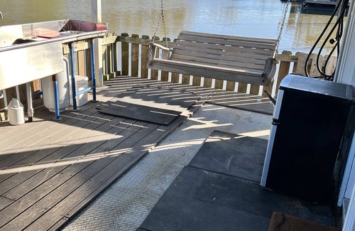 Houseboat located on a private road in Cypress Cove Marina. Drive up to private parking for 6 vehicles and walk just steps to the front door to unload your bags and tackle. The living area has plenty of room to hang out and talk about your catch with Sat TV, internet and cell booster. The kitchen has a full refrigerator, microwave, gas oven/range, coffee pot and everything you need to cook your fresh catch. We have 2 bedrooms, one with a twin bunk and the other with two sets of twin/twin bunks. The bathroom has a full shower. The covered back deck has a 3 compartment stainless sink, cleaning station, grill, fan, porch swing and extra seating. We have plenty of boat parking along the side and back porch of the houseboat as well.