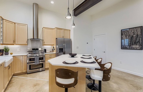 Welcome to our home! Experience bold design and cozy charm in this modern East Austin retreat. This stylish 2BR/2BA home features high ceilings, polished concrete floors, a gourmet kitchen, and plush bedrooms on separate levels for privacy. Outdoor spaces include a string-lit rooftop deck, covered patio, gated yard, and carport. Walk to bars, food trucks, and breweries, or ride minutes to Downtown, Rainey, SoCo, SXSW venues, ACL at Zilker, UT games, Moody Center, and Formula 1 at COTA.