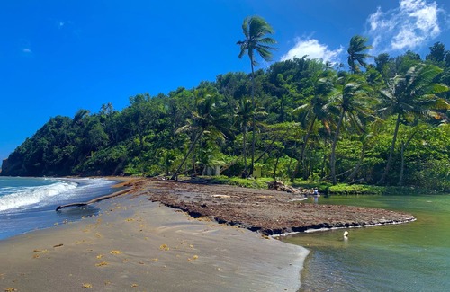 Set in two acres of tropical gardens, with an abundance of fruit trees, flowers and hummingbirds, it's just a 5 minute walk down a trail to the natural & wild black sand beach below, where one of Dominica's 365 pristine rivers meets the sea. After a swim in the ocean, a dip in the crystal-clear river water is the perfect way to rinse off the salt!
