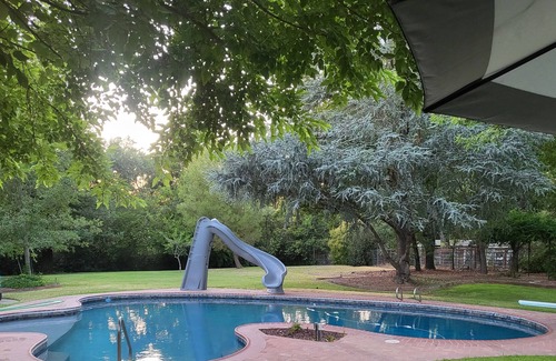 Forget your worries in this spacious and serene space. This home features a large family room with completely mirrored walls on one side, large windows and natural lighting through out the home, a hint of vintage 60's style, walk in shower with a spacious tub, high ceilings, pool with Baja shelf, slide and diving board, cozy jacuzzi, and a huge backyard. Also has a lovely wisteria trellis that is perfect for pictures! Located in a peaceful and quiet neighborhood in Sacramento, California.