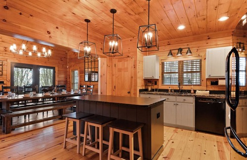Happy Place is an elegant mountain cabin with exposed beams, tongue-and-groove walls, and ceilings. This thoughtfully designed home can accommodate twelve guests and plenty of room for the whole family, with two living areas, multiple game tables, and two decks with mountain views. The kitchen is well-stocked and is open to the dining room and living room, making for easy entertaining. The dining room has vaulted ceilings and seating for twelve around a beautiful farmhouse table. The main living area has a comfortable sectional around a rock fireplace with gas logs and a Smart TV. The deck, accessible from the dining or living rooms, is sure to be your favorite place to enjoy the fresh mountain air while dining at the covered outdoor dining table. Grill your next meal on the gas grill or Blackstone gas griddle. Downstairs, guests will find a second living area with a large sectional with powered recliners at each end. Guests of all ages will enjoy a friendly game at the pool table, shuffleboard table, or arcade machine. Relax in the hot tub after a day of exploring, or roast marshmallows for S'mores at the fire pit.