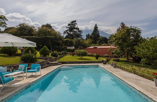 A recently renovated chef’s kitchen, accented with French sliding doors, opens to a second courtyard offering sweeping views of Acatenango and Agua. The solar-heated swimming pool is gracefully tucked into lush, manicured gardens—an oasis of tranquility and sustainability.