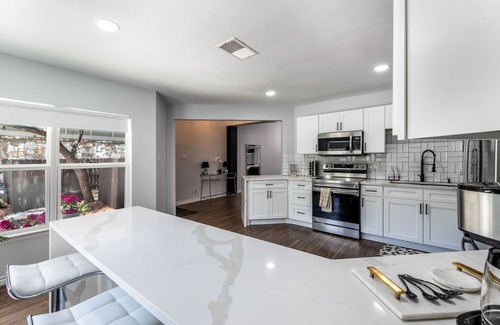 You can hang out in the large, fully stocked kitchen, have meals at the massive 12-foot table seating up to 16 people, and relax in the living room with a 75" Smart TV or cozy nook.