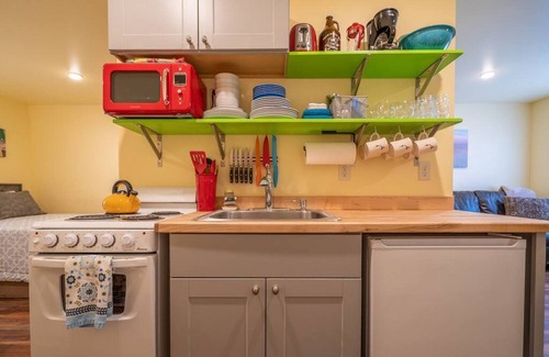 These simple & cozy, studio-style cabins, feature an open floor plan with 2 queen beds, a self-inflating AeroBed, full kitchen & bath, living room & dining area.