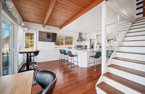 The main floor has a large living room with views of the deck and ocean. Lots of room to spread out for games and conversations. Next to the living room is a dining area. Beautiful views and something extra. On the east wall behind the white doors is a pull-down queen Murphy bed. Just a little extra sleeping space if your group gets bigger! Next to the dining room is the kitchen. Ocean views make this a great kitchen to work in. There are also plenty of bar stools for everyone to hang out with whoever does the cooking. On the deck is a BBQ if you have someone who likes to grill.