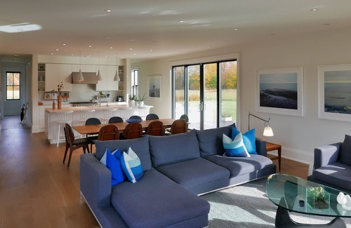 The interior of the 3,500-square-foot space is open concept with a central living, kitchen, dining area and separate den and pantry. Enjoy gatherings in the great room by the Stûv wood burning fireplace, lounge in the oversized window seat or watch TV on the UHD flatscreen.