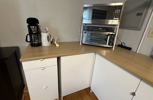 The guest suite is not big (about 460 sq. ft.), but well equipped and cozy. There is 1 bedroom and a bathroom with stall shower. The separate living room area has a couch, lift-top coffee table, TV & efficiency kitchen (it does not have a range but has a microwave, convection oven, 1 burner induction hot plate, fridge, sink, storage and includes cookware/dinnerware).