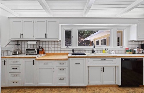 The kitchen is fully stocked with cooking and kitchenware to plate groups of up to 16. Enjoy all the comforts of home with a gas range and plenty of food storage for your family gathering.