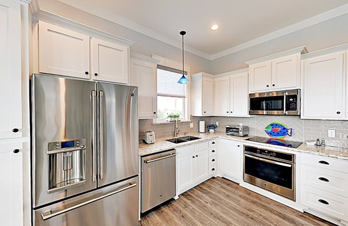 Enjoy the sea breeze from the second-story deck with seating for two, or relax on the covered patio below with seating for four. For fishing enthusiasts, an outdoor sink and wooden counters make it easy to clean your catch. An outdoor shower is also available to rinse off after a day at the beach.