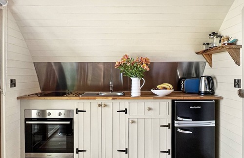 The well-equipped kitchen features an electric oven, induction hob, fridge-freezer, toaster, and kettle. On arrival, guests will find Exmoor’s own Miles tea and coffee, along with homemade biscuits and fresh milk ready to enjoy.