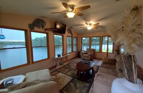 A beautiful peace of paradise in a residential quiet area located in a cul-de-sac of Sanchez Avenue, a 4 bedroom, 3 full baths, on a 3/4 acre waterfront property with a gazebo and fire pit in a fenced in backyard, you can fish off the property, there is a park across the street with a playground fenced in, plus a boat ramp that goes out into Halifax River, there is also a RV hook up located in the courtyard where the new grill and a screened-in patio are located. The home has 3 king size beds, 1 queen as well as a battery operated blow up queen size and a single mattress, all bedrooms have blackout curtains, you can even play pool as you watch the sunsets with many more amenities. Come and be with the wildlife, dolphins and manatees.