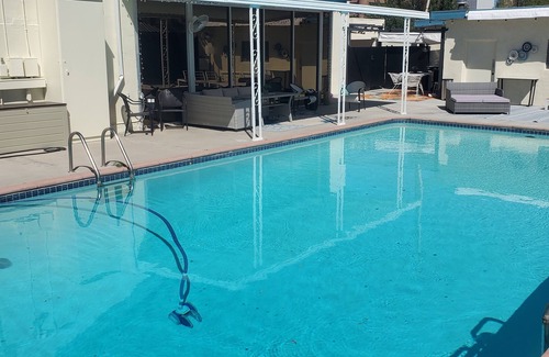 The huge old school swimming pool, original patio cover takes you back to 1950's Vegas, and new automatic awnings to give you sun or shade at the push of a button.