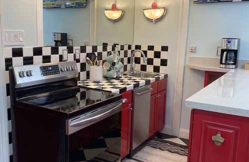 This private accommodation occupies the ground level of a large private home on Grand lake. Owners live on property and are readily available for guest assistance. The VRBO occupies approximately 1300 square feet. The majority dedicated to living spaces and a large bunk area. This includes private entrance and access to deck and fenced backyard with additional features listed in description. Features include a large main living room and dining area. Master bedroom located off main living area for quiet relaxation separated from the bunk area. Complete with built-in dresser so you can settle in and put the suitcases away. Secondary living space with full kitchen and bunks is a 1950’s retro style space that will thrill the kids. The rental provides sleeping accommodations for 10 guests total. Ice cream parlor bar stools for sitting at the counter to enjoy snacks or ice-cream sundaes. A large TV in both living areas with WIFI, ROKU and DVD player with a selection of movies available for viewing enjoyment after a long day at the lakefront. A convenient beverage and snack bar located near dining area for your use, stocked with a variety of snacks and Keurig for your coffee enjoyment. Board games for kids and adults supplied and additional children’s activities for quiet times at the end of a busy lake day. Bathroom completely remodeled including oversize standard tub and bathing supplies included, washer and dryer with laundry soap provided for your needs.