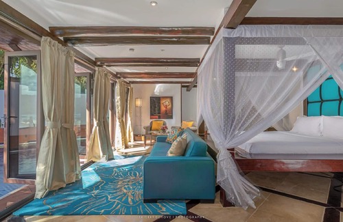With its own private driveway and parking or walking down from the Main House past the large infinity pool and down on to the private beach you come to the 4 bedroom Beach House. Each spacious room has it own private entrance, and one of which opens up with direct access to the private Beach House swimming pool, whilst the other ground floor suite opens up onto a private garden. The rooms on the top floor are 1,200 square feet (120m2) in size, and the two on the ground floor are 900 square feet (90m2). Each of these bedrooms has a large en-suite bathroom and an additional outdoor shower for two. The Beach House has a full kitchen, outdoor Tiki kitchen and BBQ, an additional private laundry room, private deck and seating for 20 people comfortably. There is also a sitting room with doors that open up fully onto the beach and an additional half bath. In addition, each bedroom has a king sized pull-out sofa bed and additional beds can easily be placed in these rooms.