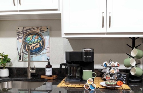 *Fully stocked kitchen with stainless steel appliances, cooking essentials, and elegant dinnerware—perfect for home-cooked meals or takeout from Branson’s best restaurants.