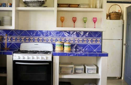 Kitchen equipment: 1 refrigerator and a big freezer, oven, microwave, Toaster oven, Coffee Machine, blender, plates, glasses, mugs, cutlery, Kitchen Knives, Pots and pans.