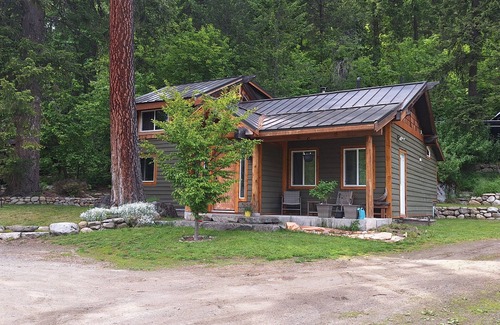 Nestled below large pine and fir trees lies this newly built cabin. Landscaped with stone gardens, patio, stairs and walls are sure to impress. On our 17 acre property where our family lives, there are large shared green spaces with fruit trees and a fire pit area, trails/ roads through the forest. The home features wood trim and vaulted ceilings thruout, new sectional couch, high end appliances, fully stocked kitchen, coffee/ tea bar, office, laundry and bathroom. Tvs in living room and main bedroom, high speed wireless internet, USB/ wireless charging/ Bluetooth speaker alarm clocks, blackout curtains, 100% cotton linens on the queen beds and double futon, soaker tub and walk in shower in the ensuite. Small patio areas to enjoy your morning coffee or evening brew. There is an outdoor gas fireplace and wood fire pit for use, with stockpile of firewood, kindling and roasting sticks, badminton / volleyball net, frisbee, and soccer ball for outdoor fun on property