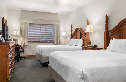 Double Queen (Sleeps 4): Includes 2 queen beds, dresser, flat screen HD television, desk, desk lamp & organizer, nightstand with lamp, full bath/shower with granite countertops and granite surround.