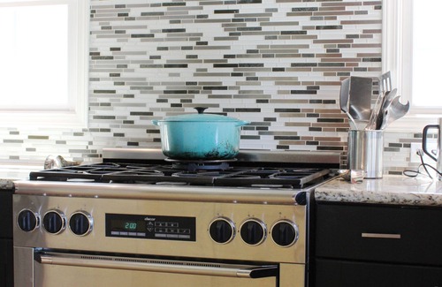 KITCHEN - large open vaulted beamed ceiling gourmet kitchen perfect for serving a large crowd or small intimate gathering. It includes a large stainless steel island with stools for 6, a professional 6 burner Dacor range/oven, a built-in Kitchen Aid convection microwave, and 2nd oven, two sinks, each with instant hot and the main sink with REVERSE OSMOSIS water dispenser. Large built-in refrigerator plus sliding door pantry. The remaining kitchen counters are slab granite and the kitchen includes every cooking amenity imaginable, not to mention a fully stocked coffee corner with complimentary local coffee. The kitchen overlooks the backyard playground, patio and hot tub area with large windows, a sliding glass door to back patio and a sliding Nana window to create an incredible outdoor room experience.