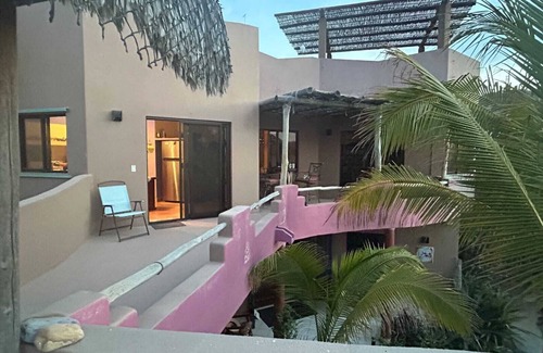 The main house has two bedrooms: one with a queen bed, and the other with three single beds — each with its own en-suite bathroom. There's also a detached casita featuring a double bed, a single bed, and a full bathroom. The property includes a private courtyard, charcoal BBQ, pizza oven, garden, and a third-story palapa with stunning panoramic views of the sea, boats, and even fish.