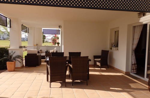 This apartment is Situated in one of the quieter areas of the resort . The dining area is accessed by sliding doors from both the bedroom and the lounge, there is a large terrace overlooking the golf course with outdoor furniture for lounging and eating, comprising of 2 seater sofas and 2 chairs, along with a dining table seating 6.