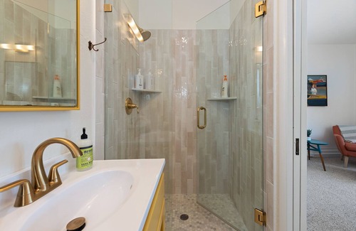 Upstairs you'll find 4 bedrooms, all with an updated and stylish aesthetic. There are 2 queen beds, a bunk bed with a twin mattress on top and full on the bottom, and a full size bed with an attached bath. The bedrooms are comfortably appointed with high-quality bedding and linens. The bathroom has been updated with modern fixtures and finishes.