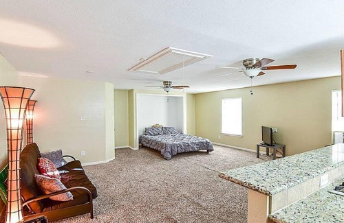 Feel Free 2 B Free in this private studio apartment, cozily nestled over an off limits two car garage overlooking a sparkling private pool.. This property boasts a comfy fold out bed with fresh linens and private bath with stand up shower, walk in closet, kitchenette with stovetop, microwave, mini fridge, and fully stocked essentials for your convenience.. Comfortably sleeps up to 2 adults.. BOOK TODAY & STAY TONIGHT with the EASY BREEZY last minute rental option. This property is a separate living entity with a *POSSIBILITY OF DOUBLE OCCUPANCY IN THE MAIN HOUSE LISTING #4702268. Long Term Renters Welcome..