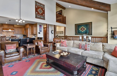 An open-concept great room adorned with mountain-themed décor and Southwestern accents welcomes guests on the main floor of this stunning 4-story cottage. Admire the charming stacked-stone fireplace while sinking into the vast sectional and leather armchairs—perfect for movie nights or relaxing after a day on the trails. Cooking is a delightful affair with the gourmet kitchen’s granite countertops and high-end appliances. The quaint breakfast bar provides relaxed seating for 4, while the traditional dining area can host up to 10 guests for sit-down dinners. Step outside and enjoy the beautiful mountain landscape on the fully furnished deck with a grill.