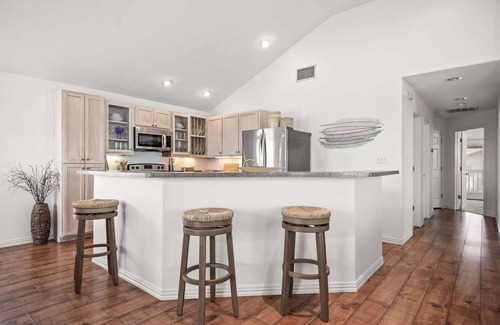 Step inside to a bright, airy interior filled with natural light and large windows that bring the outdoors in. The open concept living room invites you to kick back with a cozy sectional, an accent chair, a smart TV, and plenty of natural light provides cozy charm. The adjacent kitchen features cabinetry, stainless steel appliances, counter seating for three, and a Keurig for your morning brew. Gather around the chic dining table for relaxed meals after a day of beachcombing or fishing.