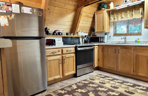 Inside the cabin, find a comfy upstairs bedroom and an inviting loft for your imagination. The lower level features a warm living room, a dining area, a fully equipped kitchen, a bathroom, and the convenience of a washer and dryer. The highlight of the cabin is the impressive wood-burning fireplace, complemented by large windows for stargazing. Step onto the spacious back deck with a hammock, ideal for stylish relaxation.