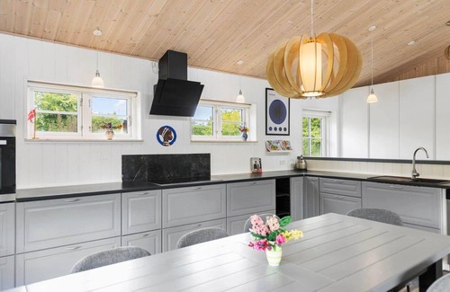 This charming holiday apartment in Kulhuse, North Sealand, offers ample space for up to 4 adults, 4 children, and 2 pets. Spanning 88 m², the apartment features a cozy interior with a fireplace, ensuring a warm and inviting atmosphere. The open kitchen is fully equipped with modern amenities, including a dishwasher, electric/gas stove, oven, microwave, refrigerator, coffee maker, and kettle — perfect for preparing family meals.