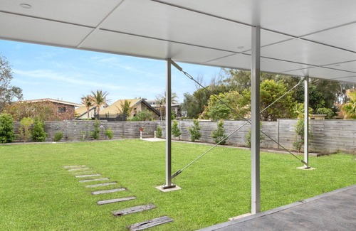 The backyard is an outdoor oasis. With a large, grassy area, it’s perfect for a game of cricket or as a play space for the family dog. A charming herb garden brimming with fresh plants adds to the coastal charm, offering you a taste of the outdoors at every turn.
