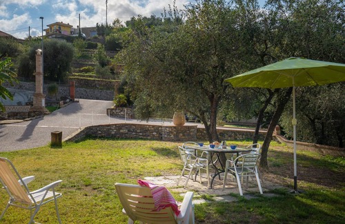 Villa "Costadoro", surrounded by trees and meadows. 4 apartments in the residence. In the district of Costadoro 3.5 km from the centre of Imperia, 8 km from the centre of Diano Marina, 30 km from the centre of San Remo, in a secluded, sunny, elevated position on top of a hill, 4 km from the sea, in the countryside. For shared use: large, beautiful, well-kept garden 12'000 m2 (fenced) with plants and flowers, orchard. Patio, garden furniture, barbecue. In the house: washing machine (for shared use). Parking (for 6 cars) on the premises. Grocery 200 m, supermarket 2.5 km, bar 200 m, bus stop 1.9 km, sandy beach "Imperia" 4 km. Walking paths from the house 100 m, cycle lane 4 km. Nearby attractions: Monte Carlo Monacco 52 km, Cervo 8 km. Please note: car recommended.