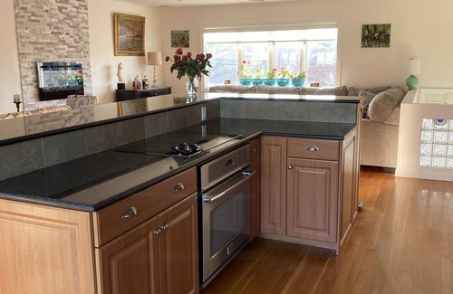 A very comfortable sofa faces the kitchen for open conversation when cooking or preparing a meal with guests. White kitchen stools accompany the large granite island, a perfect spot to enjoy a hearty breakfast. Snacks abound in the kitchen pantry for guests and the fridge is stocked with mineral water as a thank you for staying.