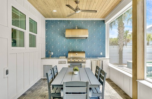 - Access to covered screened porch with a full outdoor kitchen featuring a gas grill, fridge, sink, dining table, and lounge area with a TV