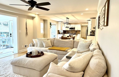 There is a half bath on the main floor across from the mudroom, right around the corner from the kitchen. Our kitchen table extends and can seat up to 10 people and so does our family room sectional. We also have a separate dining room and living room. There is a handcrafted, Balinese daybed in our sunroom where you can watch the sun rise and fall. In fact, it is not uncommon to see a family of deer visit our backyard as the sun sets. There are also two patios: one off of the sunroom with two dining tables, another seating area, an outdoor gas bbq & fire pit (total seating for up to 17) and the other off of the basement with seating for 2-4.