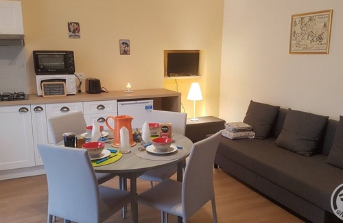 Less than 3 km from the village of St Laurent de Chamousset (with all shops & services), this renovated stone-built farmhouse is typical of the Monts du Lyonnais region. It includes 2 adjoining gîtes, each one for 4 people (1 bedroom). Owner's home on site, in another wing of building. Porch to enter the property, shared courtyard. Each accommodation is accessed via shared hall (3 steps for access or gentle slope). Gîte 'St Raphaël' is comfortable and well laid-out. Contemporary decoration. All accommodation is on the ground floor (1 step to enter). Entrance in the living room (fully fitted kitchen area, dining area, lounge area with double sofa bed), 1 bedroom (2 single beds), shower room (walk-in shower, washbasin, Wc). Travel cot on request. Bed linen and towels supplied. Laundry room shared by the 2 accommodations (washing machine). Outdoors : private terrace with garden furniture (2 steps for access). Shared garden with play area (trampoline, beach tennis, volleyball kit, badminton, petanque boules. Charcoal barbecue (shared), parking area.