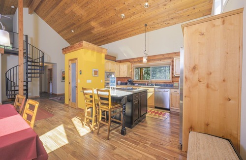 Step into the warm embrace of vaulted, open-beam wood ceilings and a wall of windows that frame stunning views of the surrounding ponderosa pines. The well-stocked kitchen makes family meals a breeze, while the open great room invites you to unwind by the gas fireplace. Downstairs, you’ll find a spacious bedroom with a king bed and sliding glass doors leading to the backyard and hot tub—perfect for morning coffee or an evening soak under the stars. There is a full bathroom on the main floor.