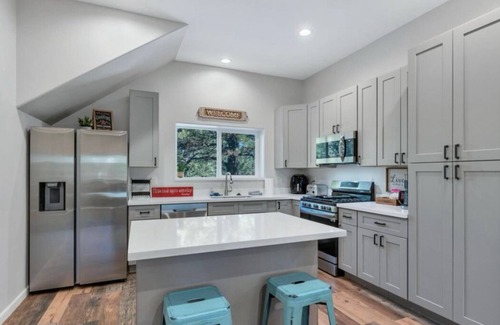 The cabin features a separate loft suite complete with 2 queen beds, 1 twin bed, 1 bath, TV, microwave, and mini fridge providing a private haven within your retreat. The main floor includes 2 bedrooms, 1 bath, and a fully equipped kitchen, perfect for preparing meals after exploring the area.