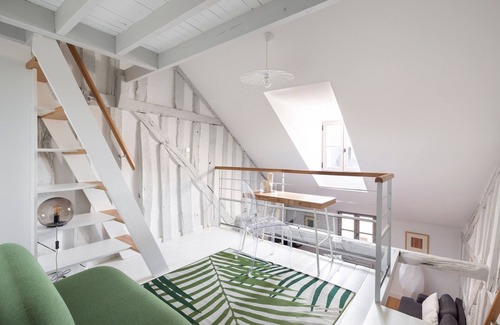 Cocoonr offers this flat in the heart of the historic centre. Located in the Rue Saint Georges, which links the Parliament of Brittany to the Palais Saint-Georges. It is following a very beautiful rehabilitation of this building in Pans de Bois, in this typical street of historic Rennes, that you will find on the 4ᵉ floor by staircase, a real Cocoon completely renovated. All the modern facilities and comforts for this two-storey flat with the authentic charm of these beams, timber-framed walls and limed patina shades.