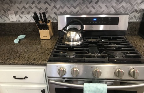 There are granite counter tops in all four bathrooms and the kitchen. The kitchen has a counter depth refrigerator to create more cooking space. There is a second refrigerator in the garage for more storage for large groups. The garage is a two-car garage with a new washer and dryer for your use.