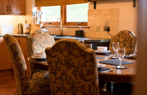 The heart of the home is the comfortable lounge at the front of the property, featuring ample seating for six. Soak in the panoramic views across Loch Linnhe. The room is warmed by a log-burning stove, creating a homely ambience enhanced by soft lighting from automated sunset lamps. A large Smart TV, coffee tables, and snug chairs provide the perfect setting for evenings in.